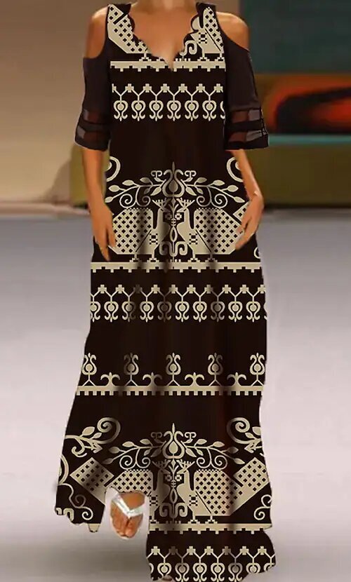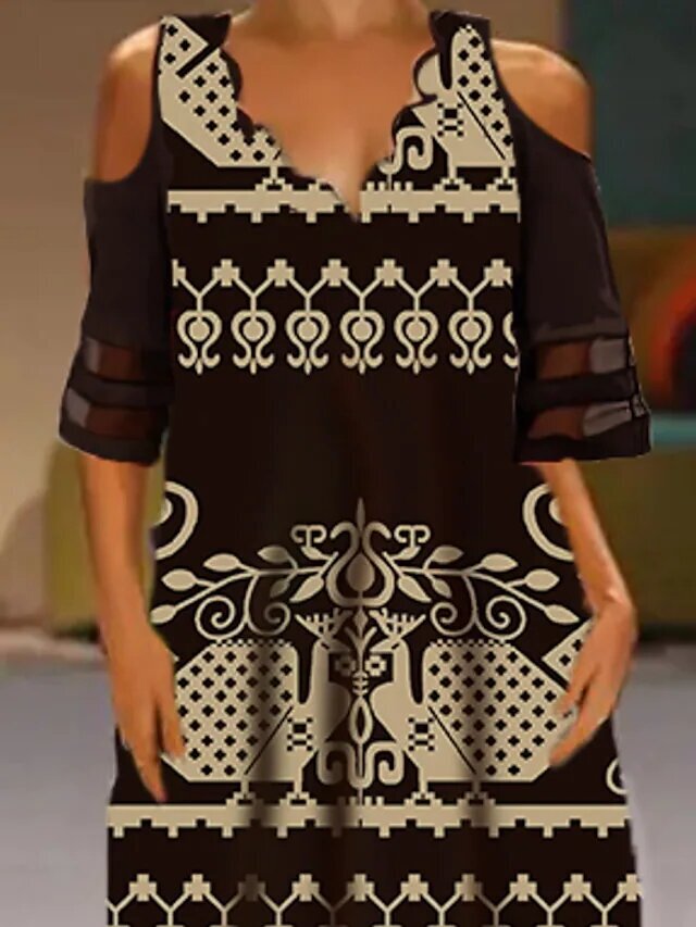 Black Half Sleeve Print Hollow Out Ruched Mesh Spring Summer V Neck Stylish Modern.