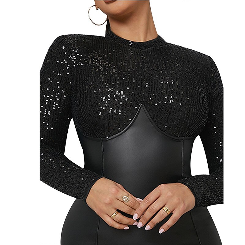 Mini Dress Black Long Sleeve Solid Color Sequins Fall Party Round Neck Stylish Casual.