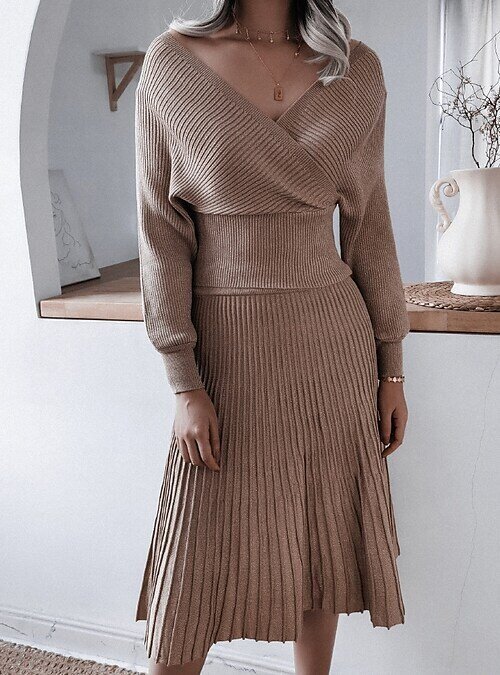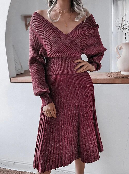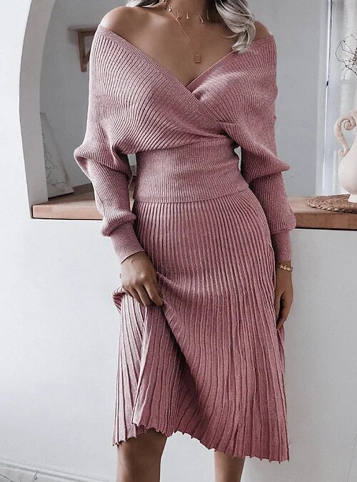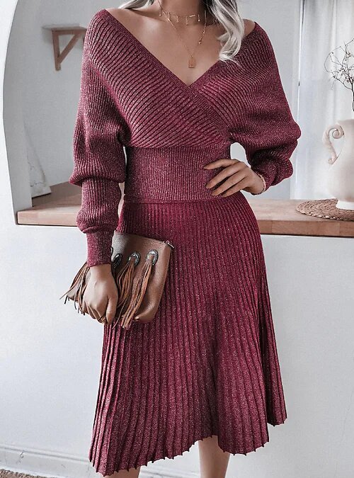 Dress Pink Wine Beige Long Sleeve Solid Color Ruched Fall Winter V Neck Work Elegant Casual.