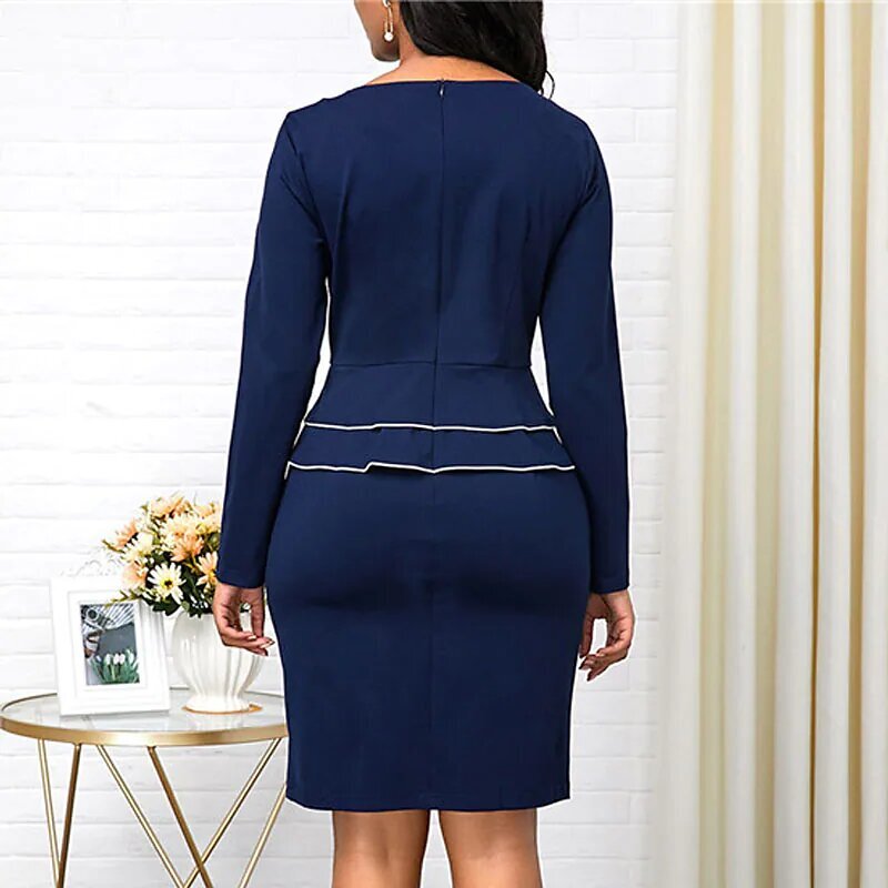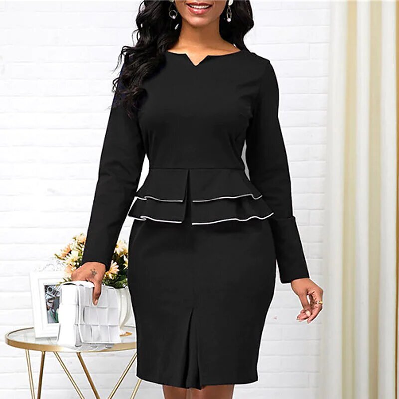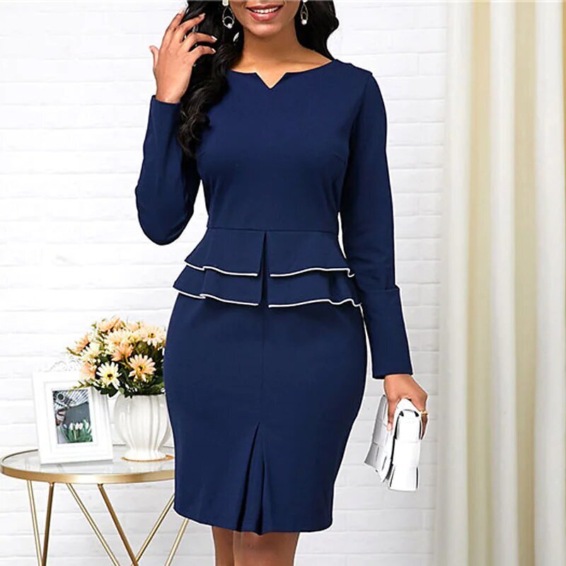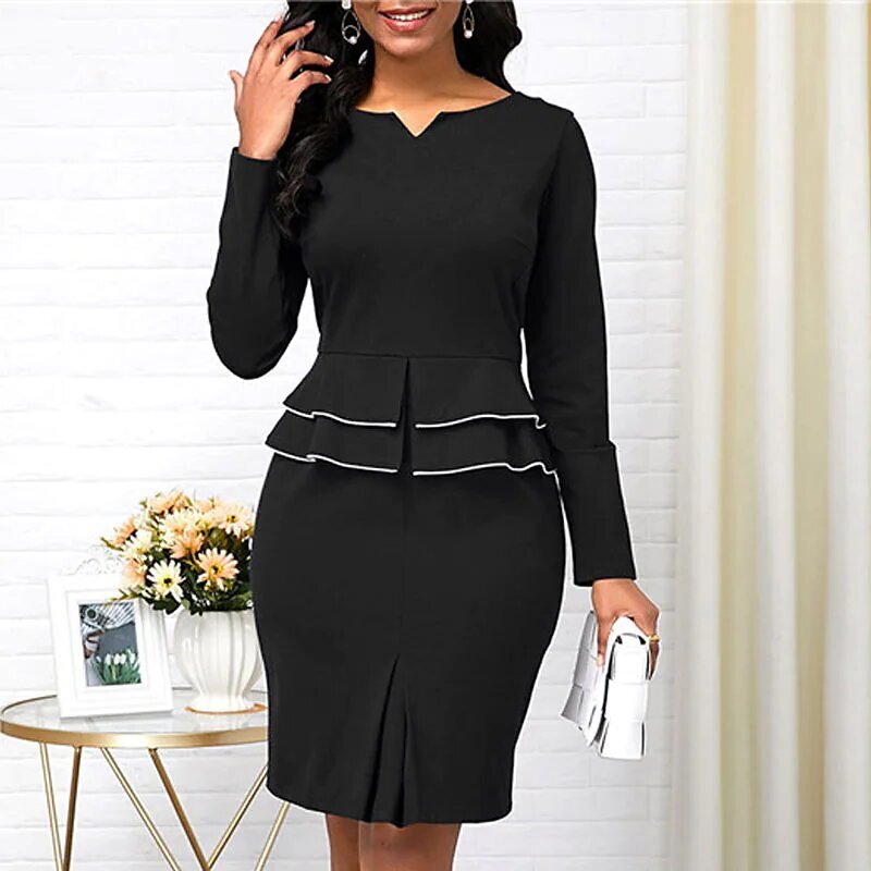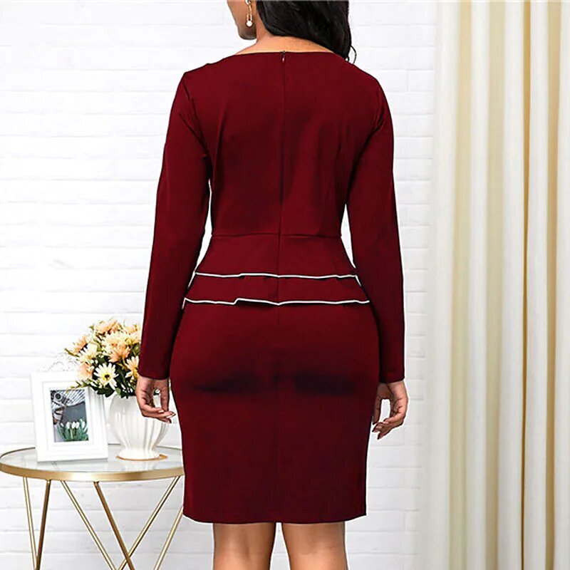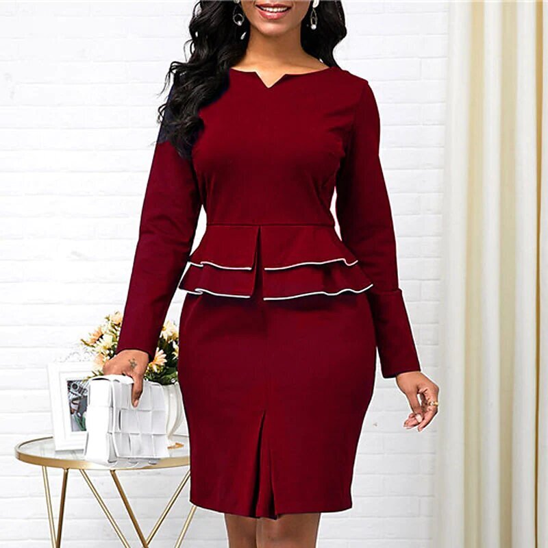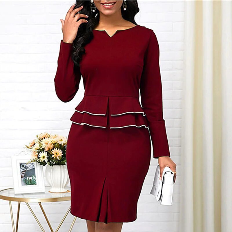 Dress Black Wine Navy Blue Long Sleeve Solid Color Ruched Ruffle Fall Winter V Neck Stylish Work Elegant.