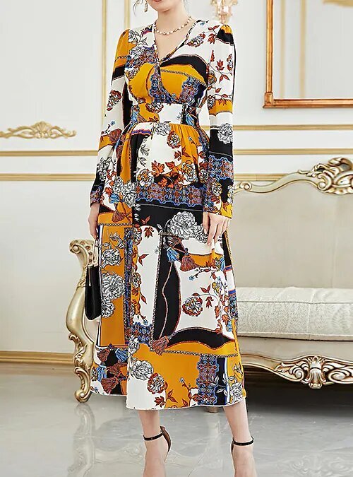 long Dress Yellow Long Sleeve Floral Print Fall Spring V Neck Stylish Modern.