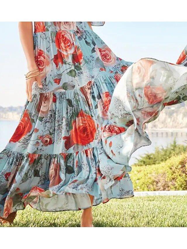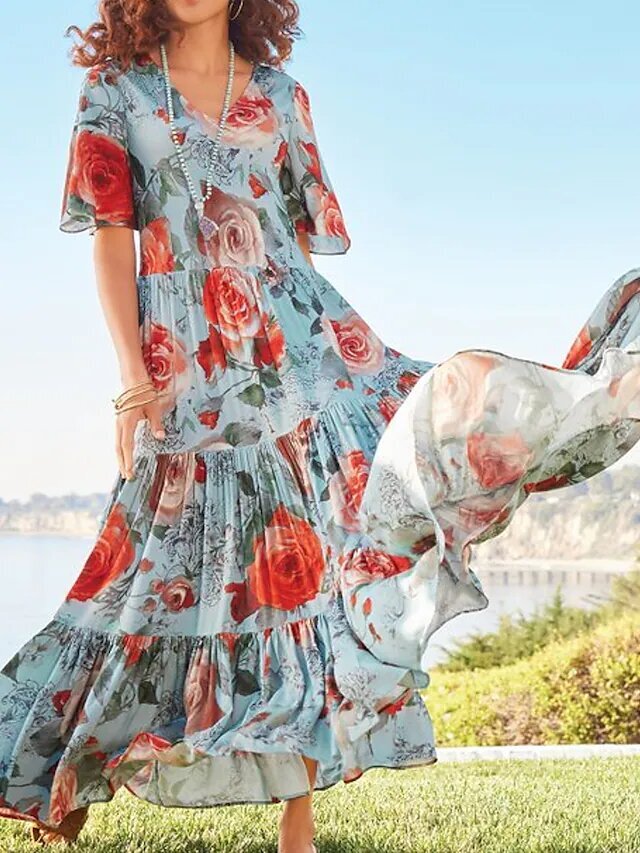 Light Blue Half Sleeve Floral Ruched Print Spring Summer V Neck Romantic Vacation.