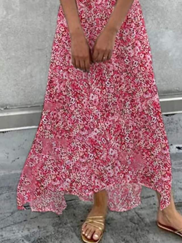 Pink Short Sleeve Floral Print Ruched Print Spring Summer V Neck Romantic Vacation.