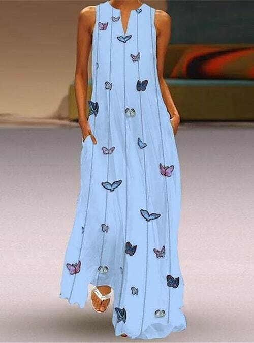 Dress Maxi long Dress White Yellow Light Blue Sleeveless Animal Print Spring Summer V Neck Casual.