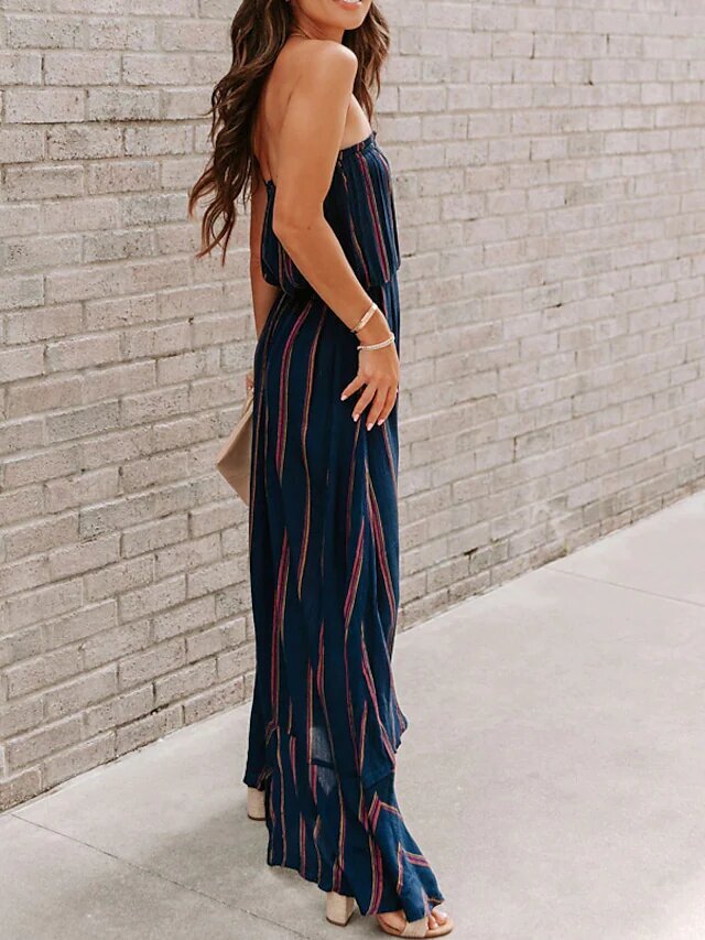 Dark Blue Sleeveless Striped Split Button Spring Summer Strapless Stylish Casual.