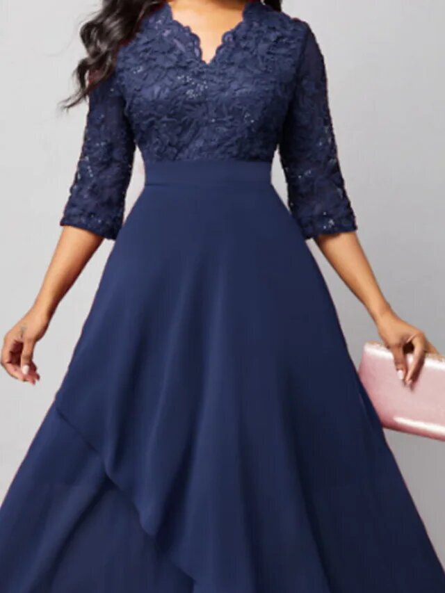 Navy Blue 3/4 Length Sleeve Print Pure Color Ruched Lace Spring Summer V Neck Elegant Fashion Modern Party.