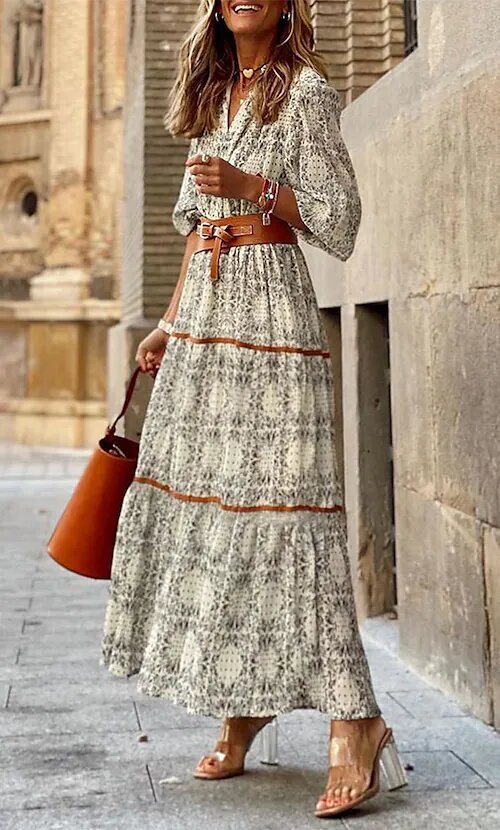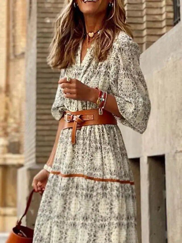 Khaki Half Sleeve Print Ruched Print Spring Summer V Neck Casual Modern.