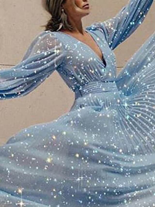 Blue Long Sleeve Pure Color Sequins Smocked Fall Winter Deep V Party Fashion.