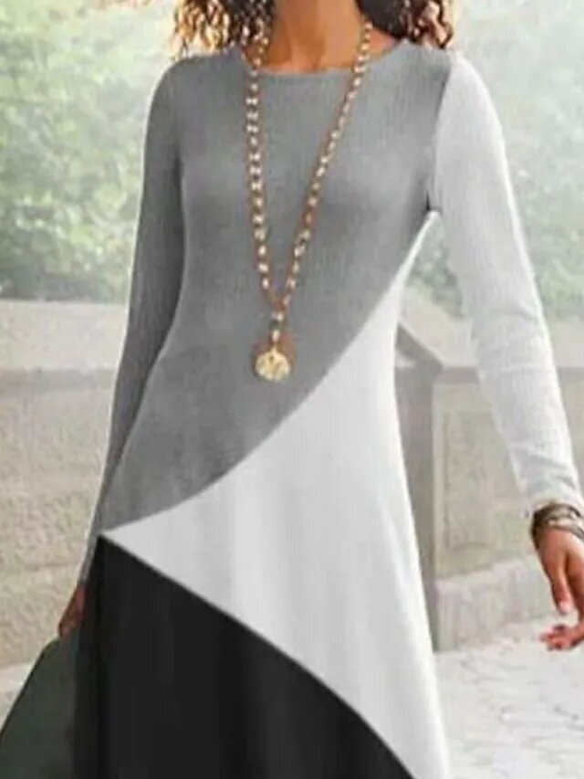 Black gray Long Sleeve Color Gradient Ruched Patchwork Print Fall Winter Crew Neck Casual Modern.