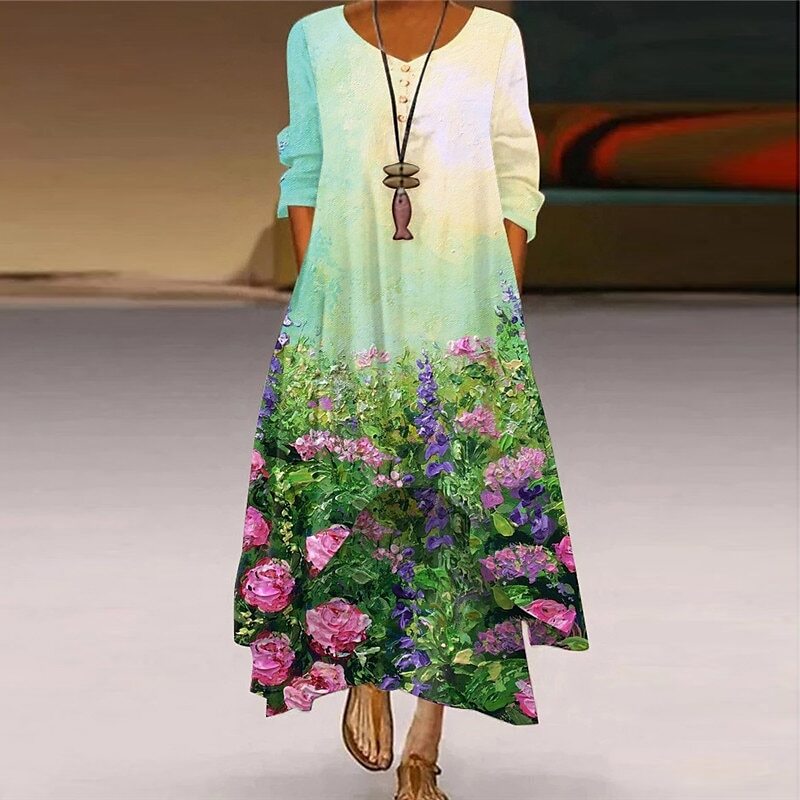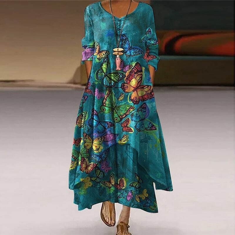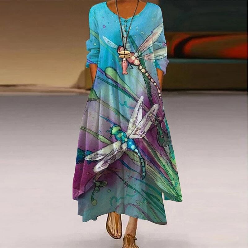 Dress Maxi long Dress Blue Light Green Navy Blue Blue Black Beige Long Sleeve Floral Butterfly Animal Pocket Button Print Fall Winter V Neck Elegant Casual.