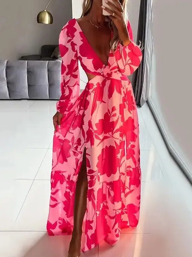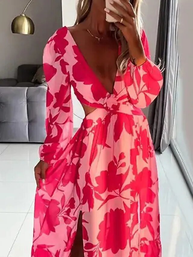 Fuchsia Long Sleeve Floral Backless Split Fall Winter Deep V Casual Modern.