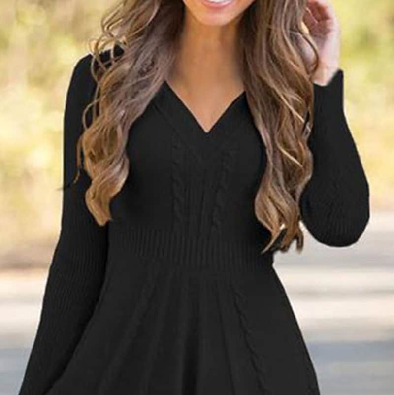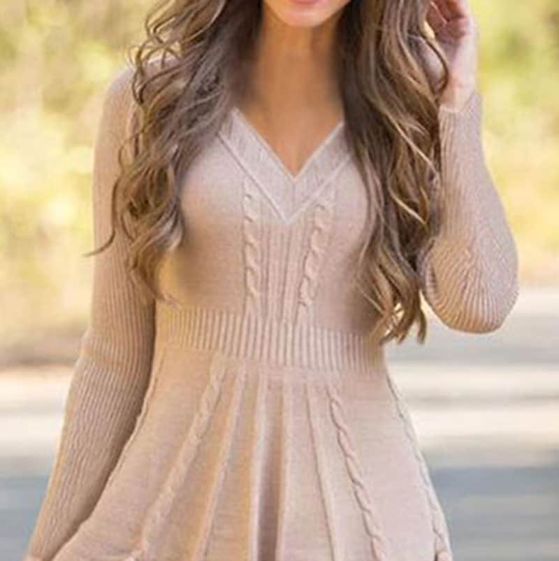 Mini Dress Black Beige Long Sleeve Solid Color Jacquard Fall Winter V Neck Elegant Casual.
