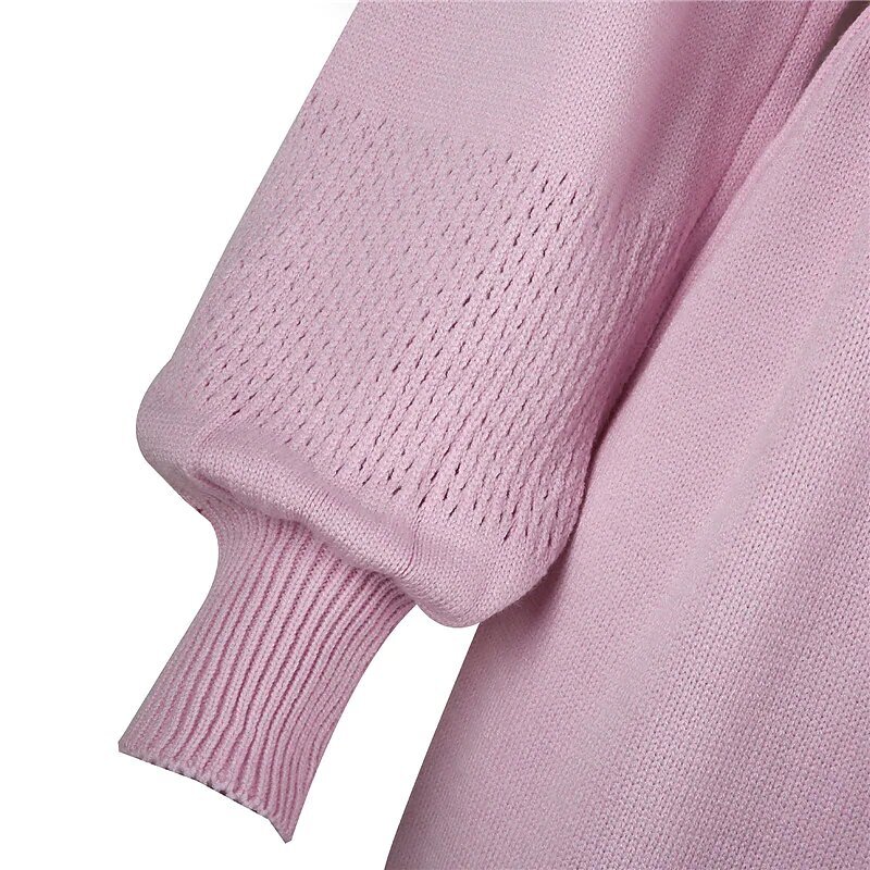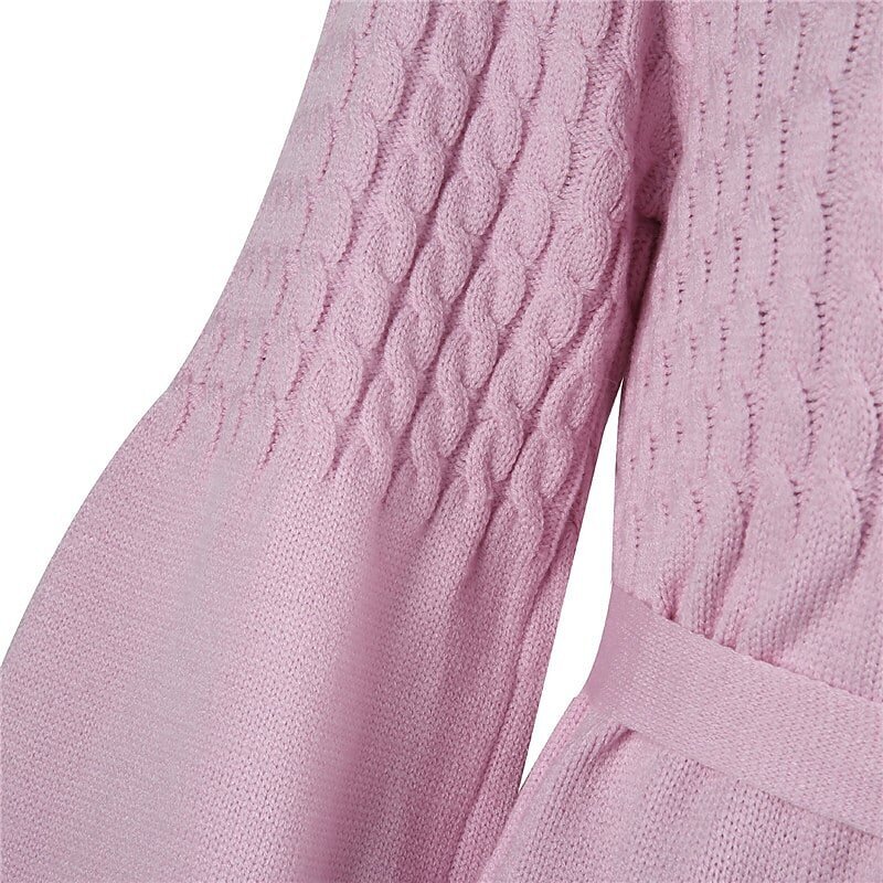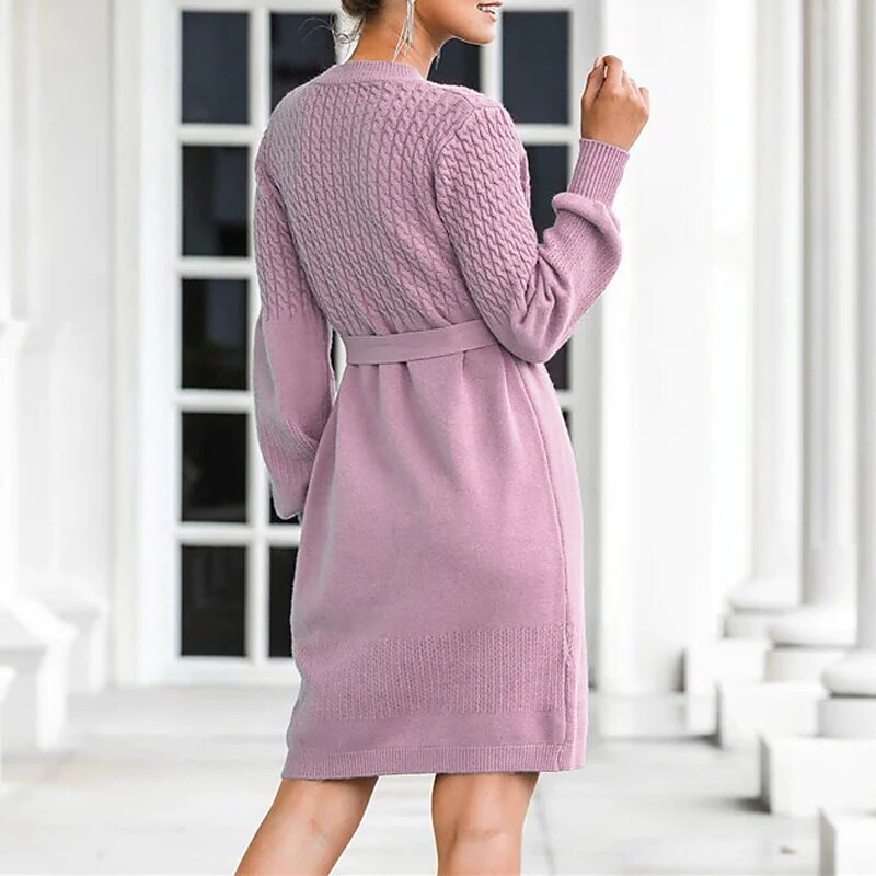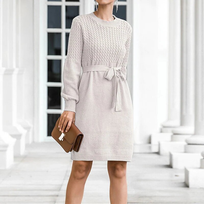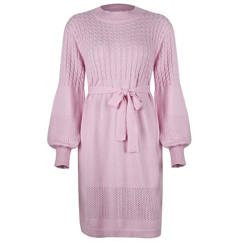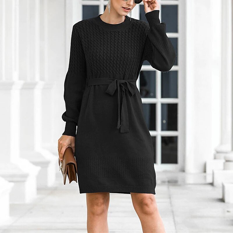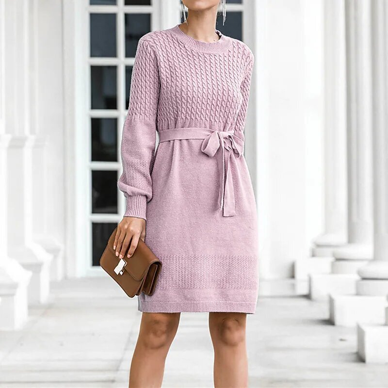 Mini Dress Black Pink Beige Long Sleeve Solid Color Lace up Fall Winter Round Neck Casual.