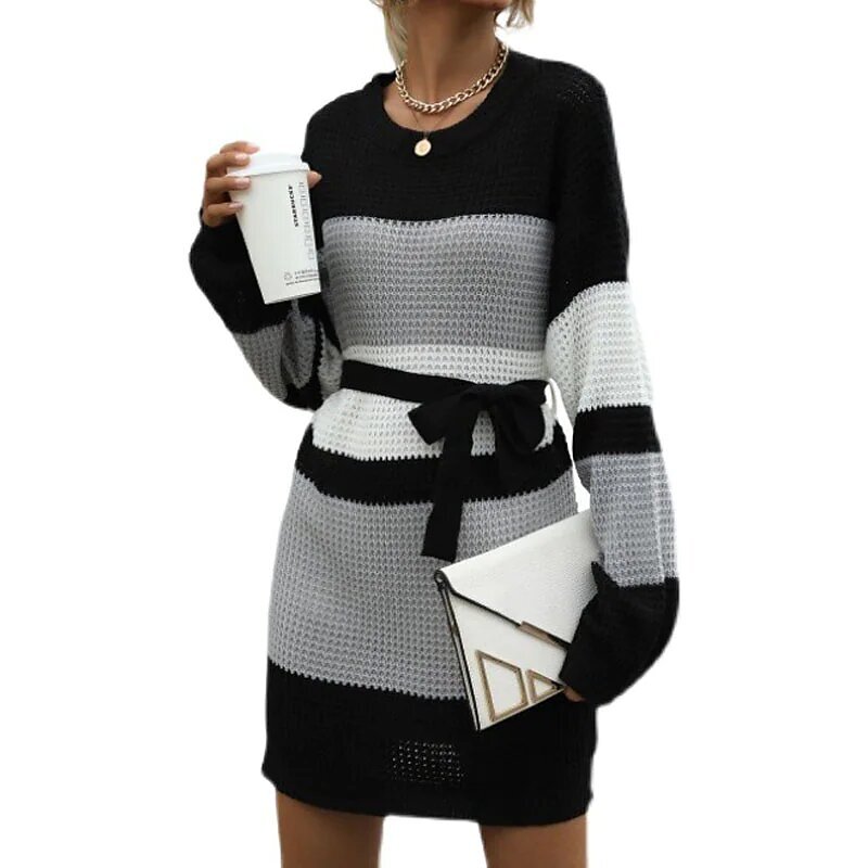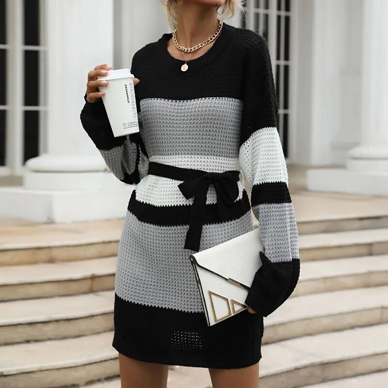 Mini Dress Black Long Sleeve Color Block Lace up Fall Winter Round Neck Casual.