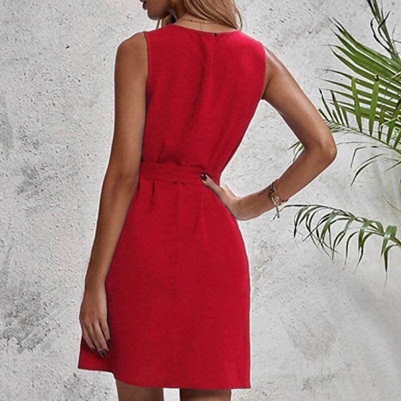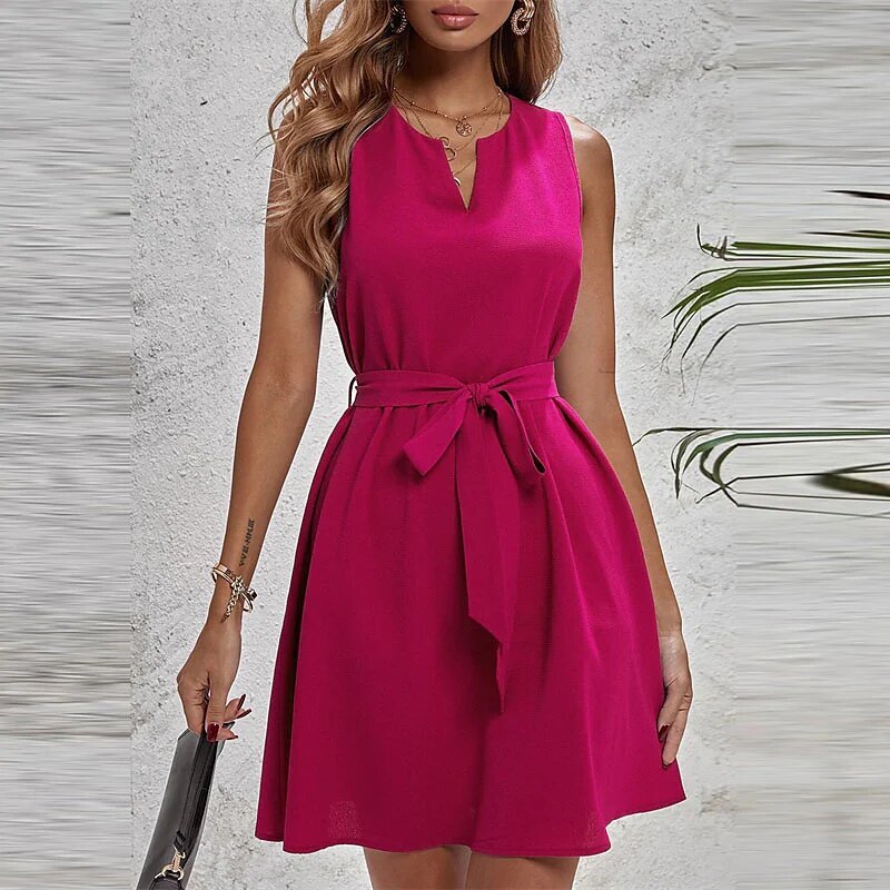 Mini Dress Black Blue Fuchsia Red Sleeveless Pure Color Lace up Spring Summer V Neck Stylish Elegant.