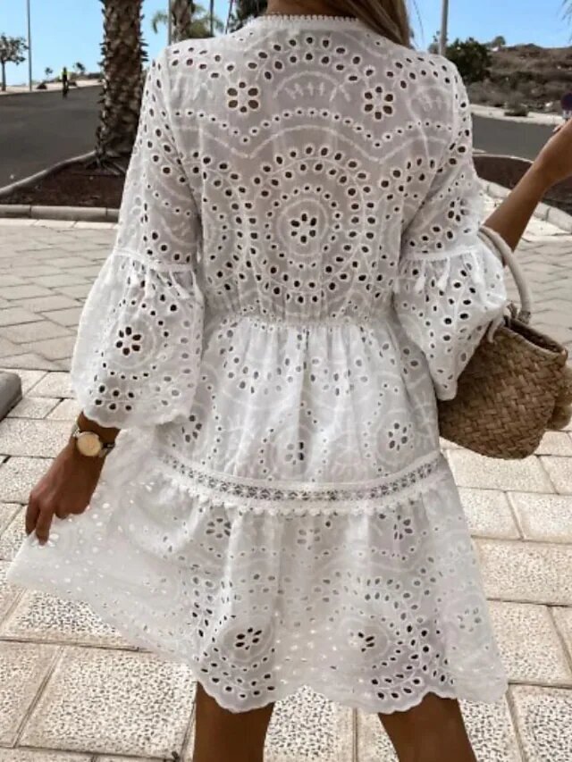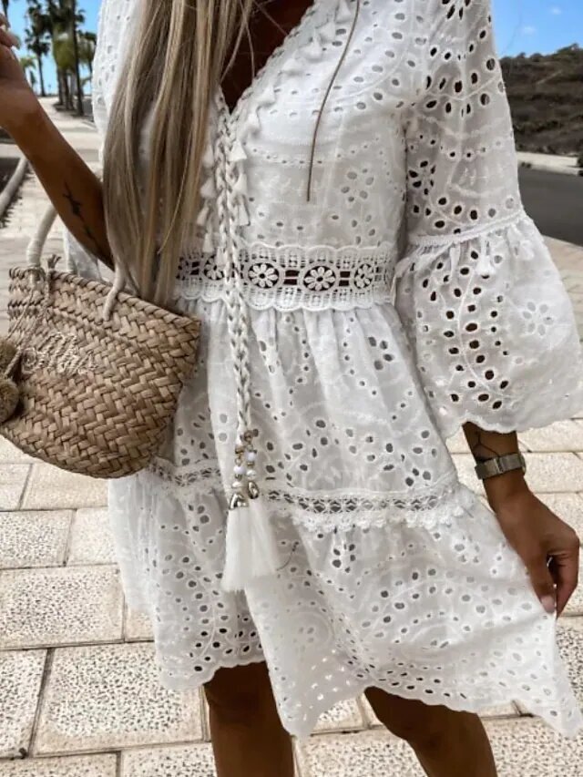 White Beige 3/4 Length Sleeve Pure Color Hollow Out Spring Summer V Neck Casual.