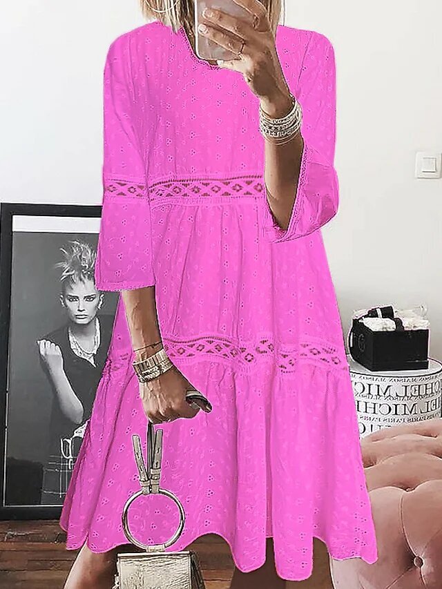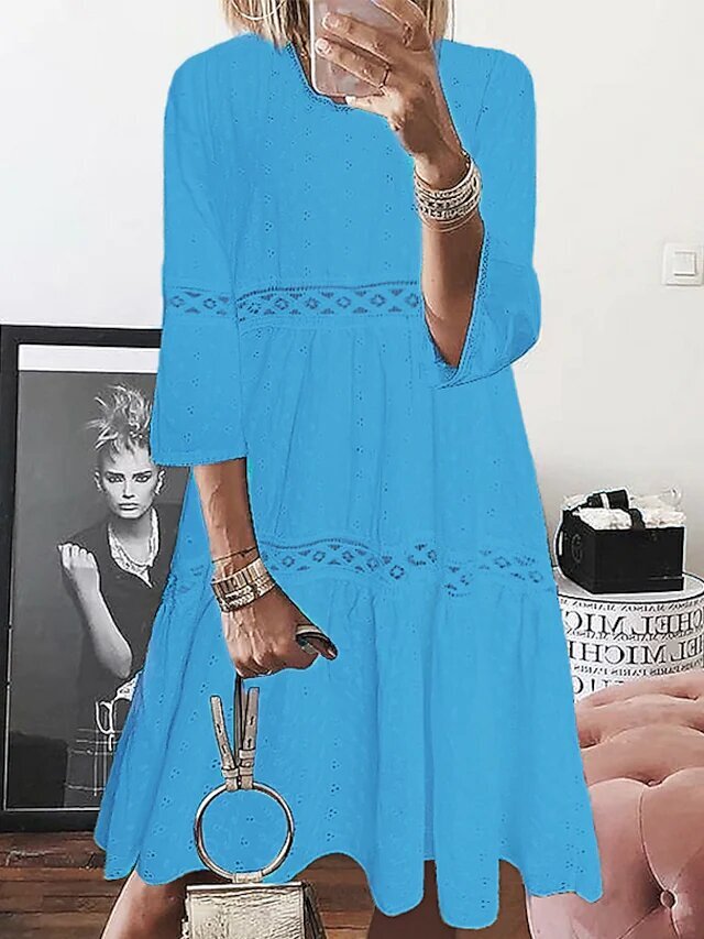 White Purple Yellow Light Blue 3/4 Length Sleeve Eyelet Lace Spring Summer Round Neck Hot Casual.