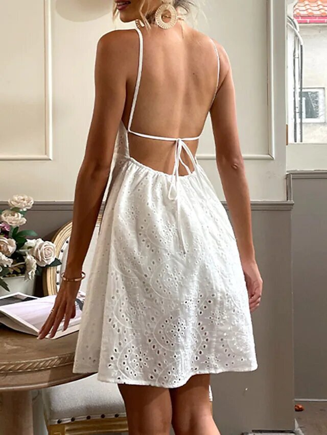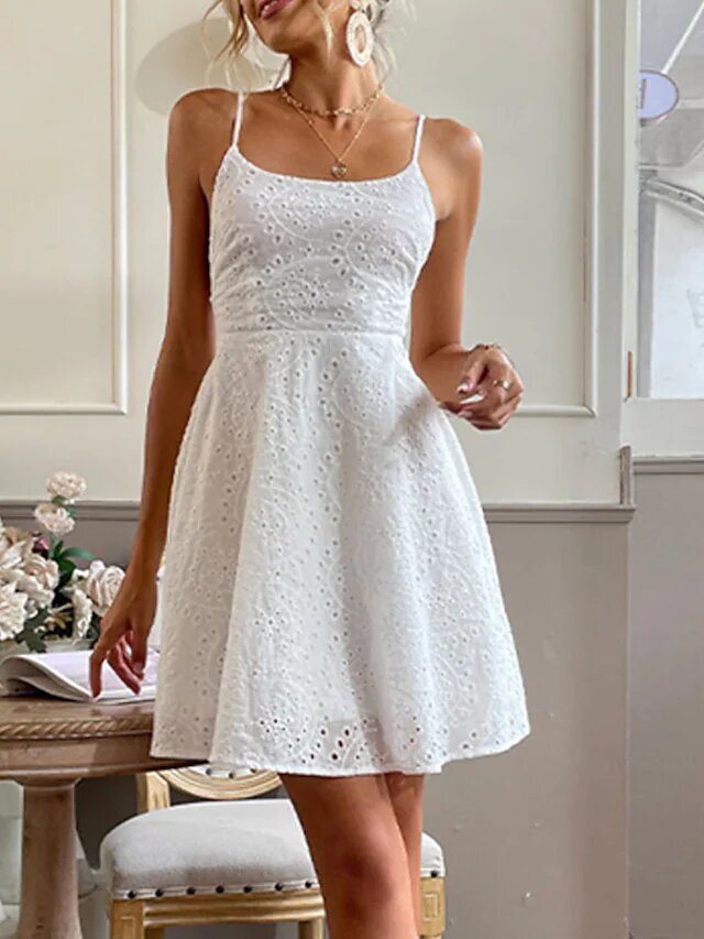 White Sleeveless Pure Color Embroidered Lace Cold Shoulder Spring Summer Spaghetti Strap Stylish Sexy.