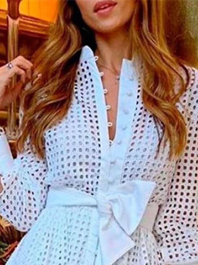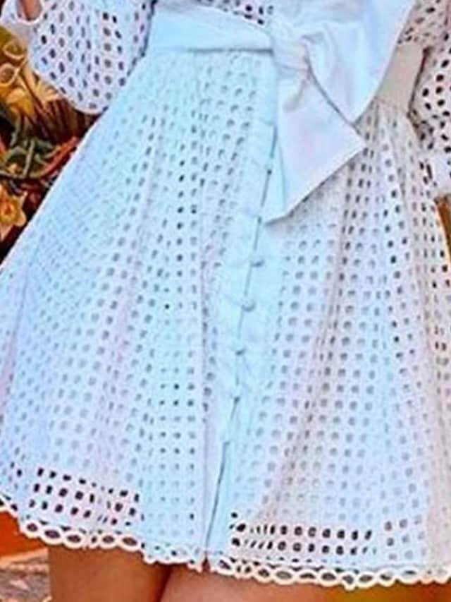 White Long Sleeve Pure Color Hollow Out Bow Fall Winter Stand Collar Stylish Elegant.