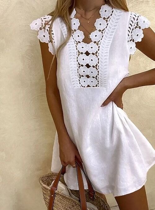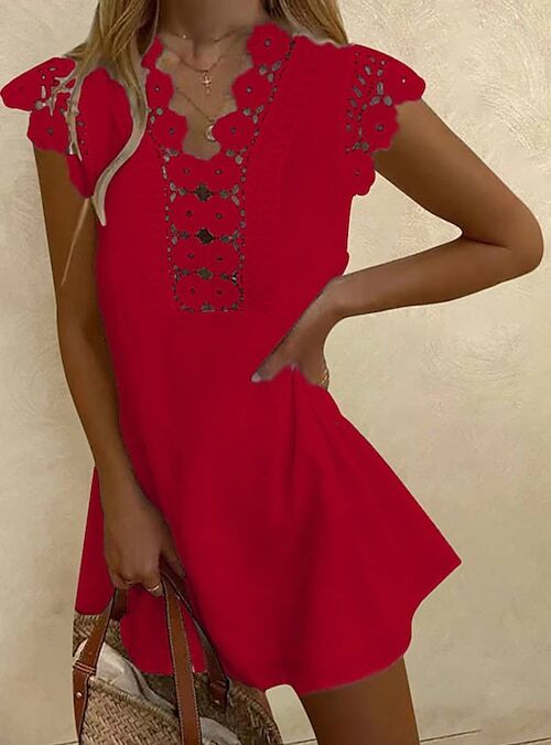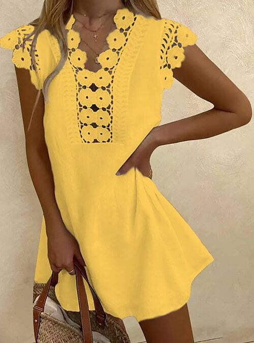 Dress Short Mini Dress Blue White Black Pink Fuchsia Red Yellow Sleeveless Floral Embroidered Hollow Out Spring Summer.