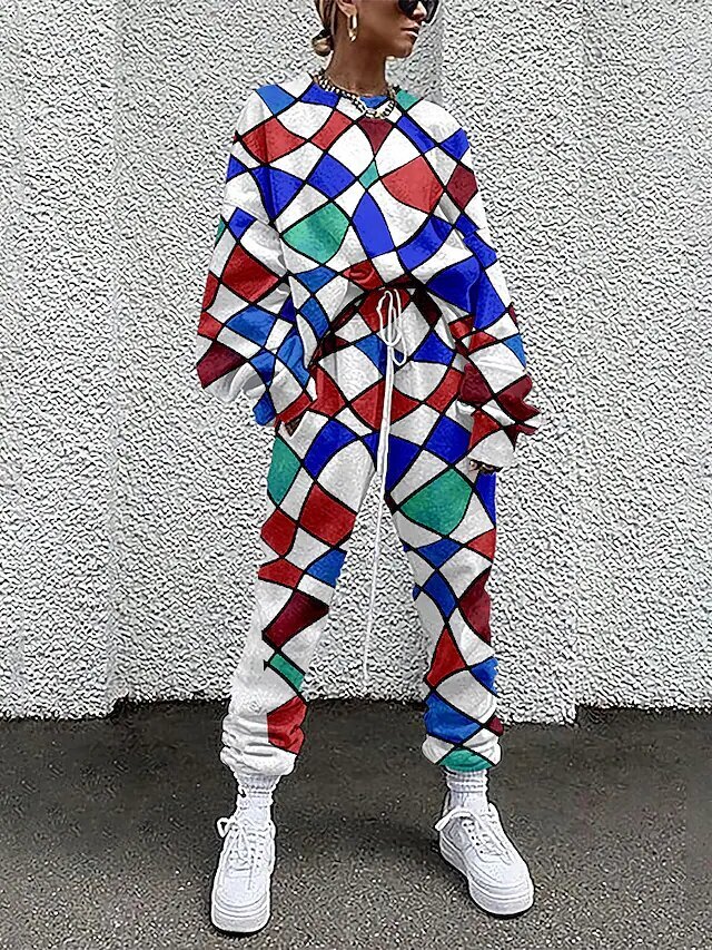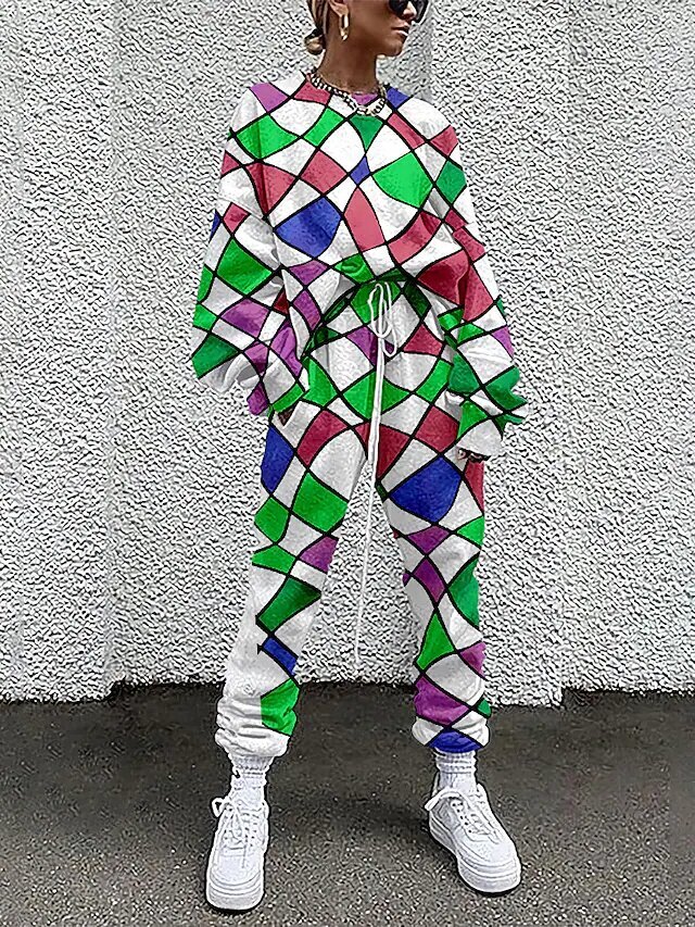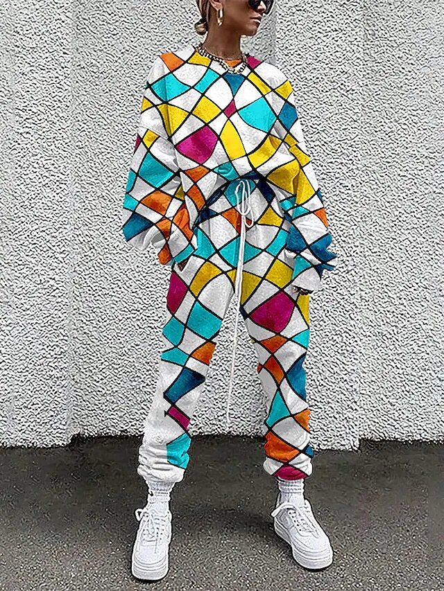 Block Geometric Sports Outdoor Casual Two Piece Set Sweatshirt Tracksuit Pants Sets Jogger Pants Drawstring.