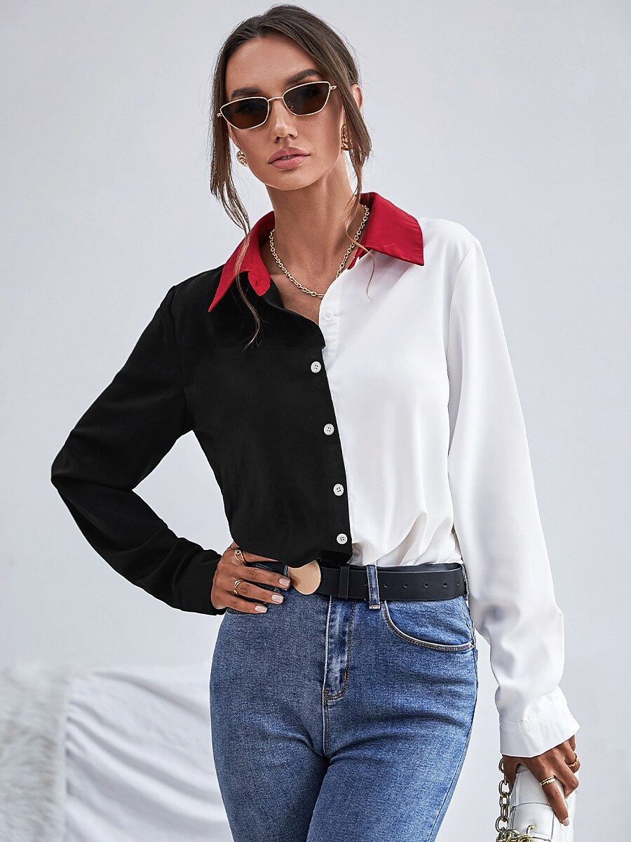Long Sleeve Patchwork Button Shirt Collar Casua