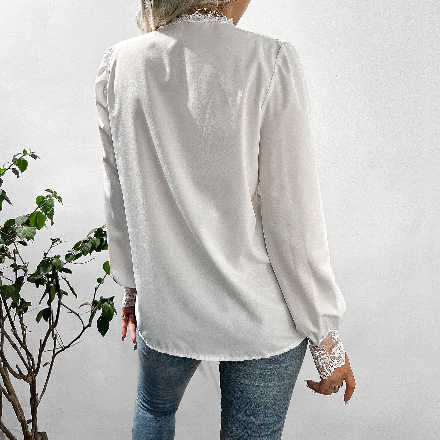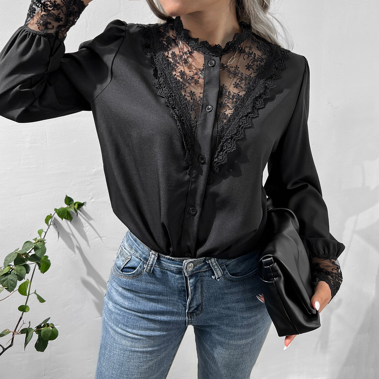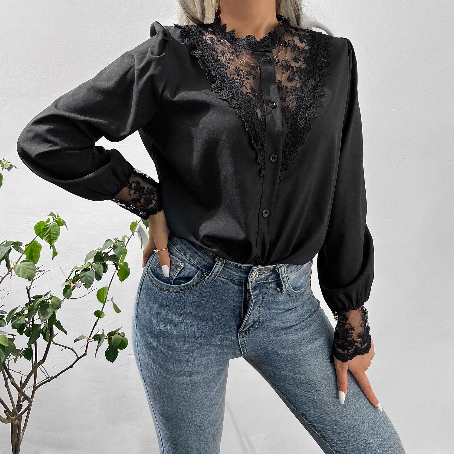 Sleeve Lace Patchwork Button Round Neck Casual Streetwear