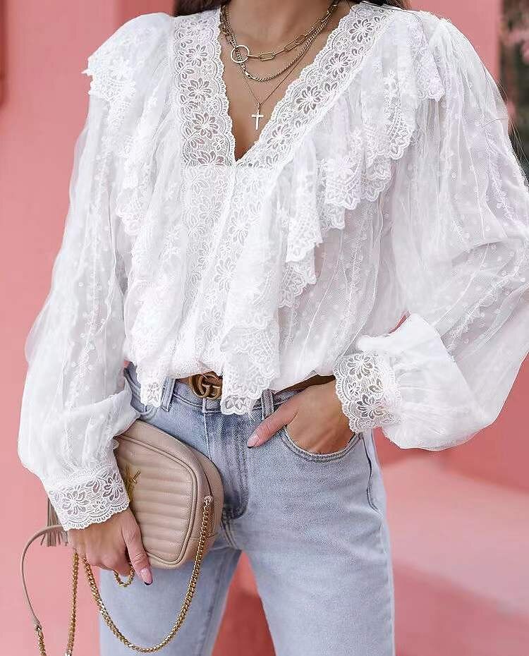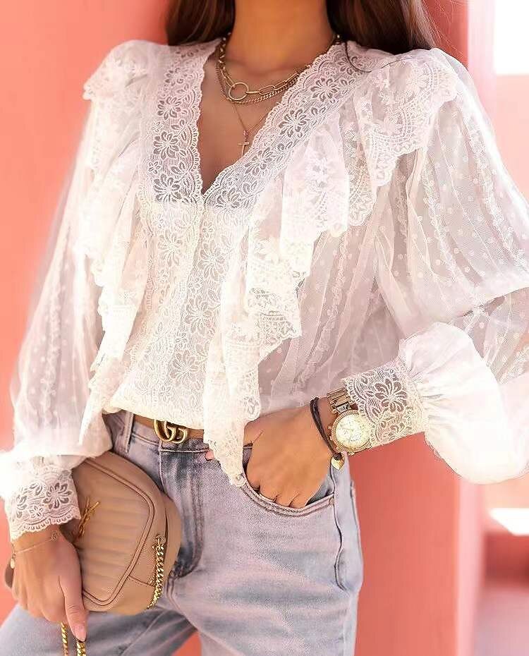 Sleeve Ruffle Lace V Neck Casual Streetwear