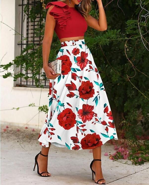 Blouse Skirt Sets Boho Streetwear Sexy Pink Red Cocktail Party Date Vacation Floral Print Maxi Skirt.