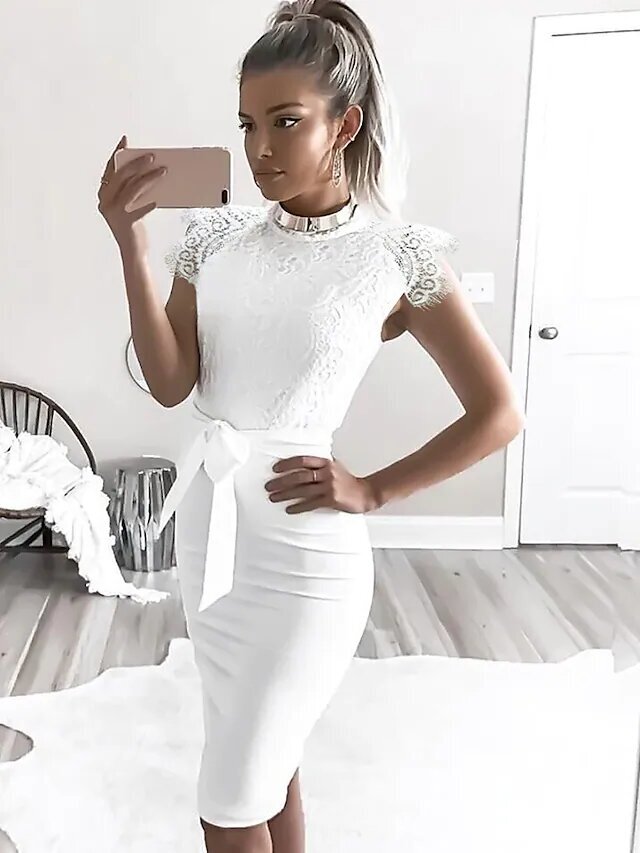 White Sleeveless Solid Color Lace up Bow Spring Summer Round Neck Party Hot Elegant Party Slim.