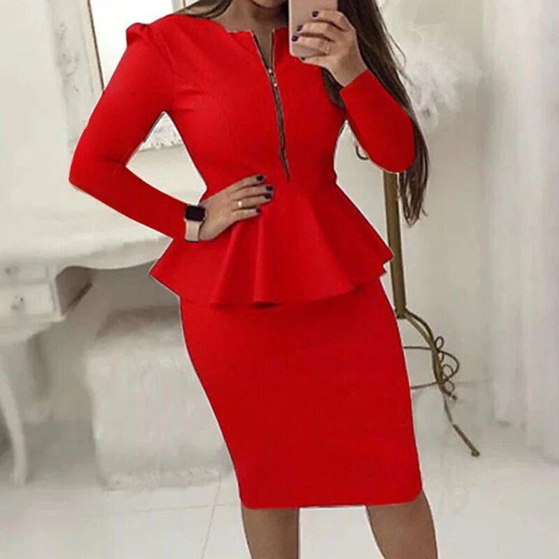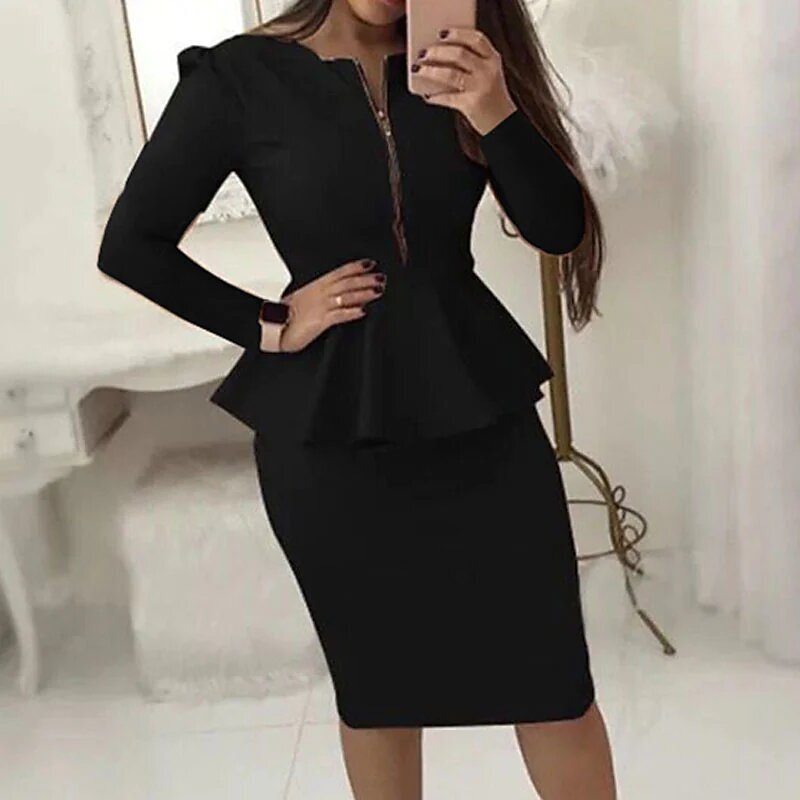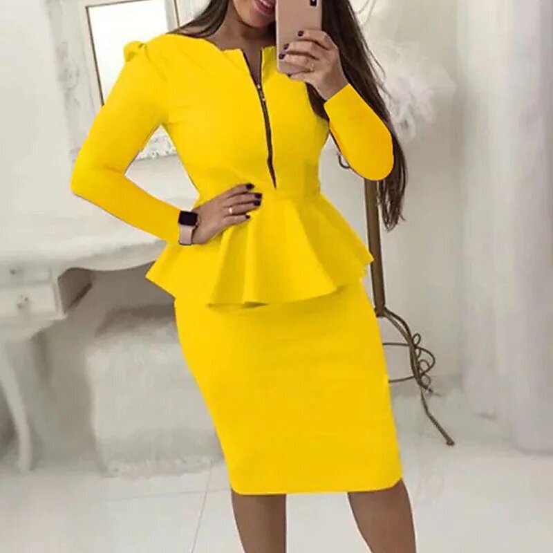 Midi Dress Black Yellow Red Long Sleeve Pure Color Ruffle Zipper Spring Summer Crew Neck Work Elegant Mature.