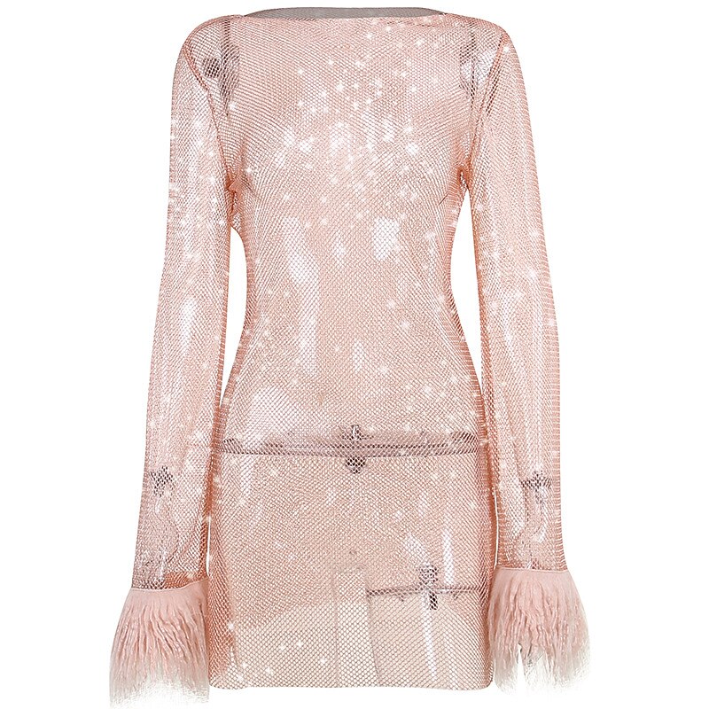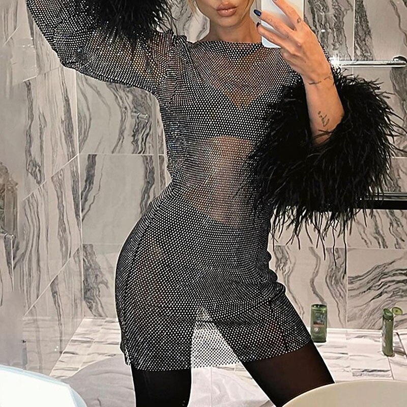 Long Sleeve Pure Color Sequins Mesh Feather Spring Summer Crew Neck Elegant Sexy Modern Party Dress.