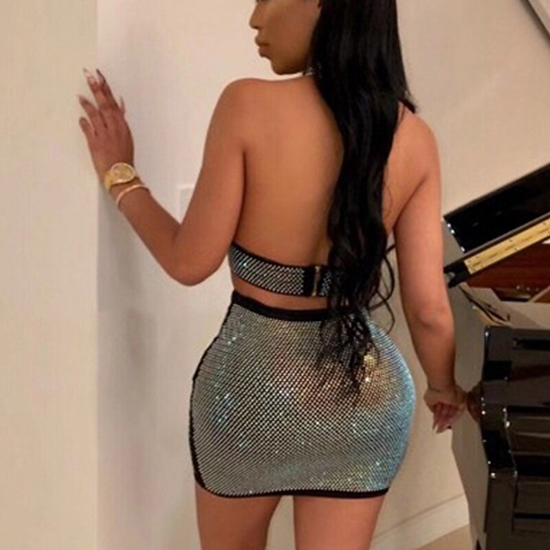 Mini Dress Black Sleeveless Color Block Backless Sequins Cut Out Spring Summer Halter Neck Party Stylish Sexy.