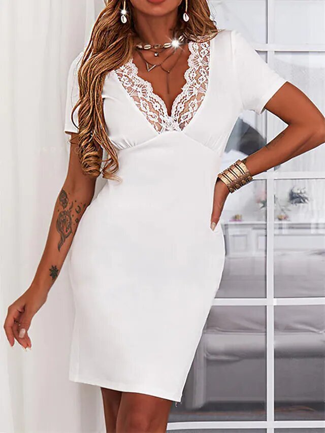 White Short Sleeve Pure Color Lace Spring Summer V Neck Stylish Sexy Mature.
