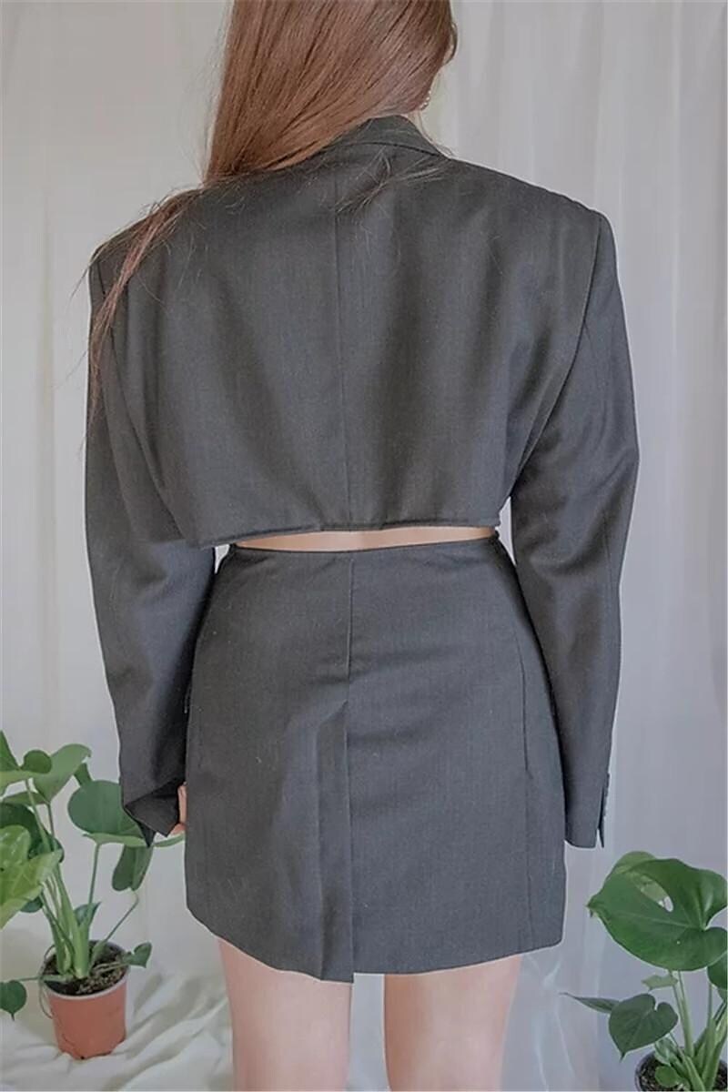 Crop Top Blazer Skirt Sets Beige Gray Office Work Business Solid Color Shirt Collar.