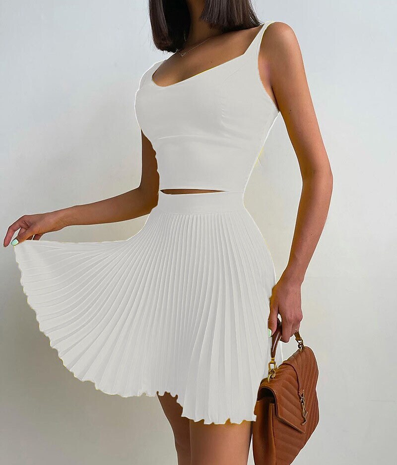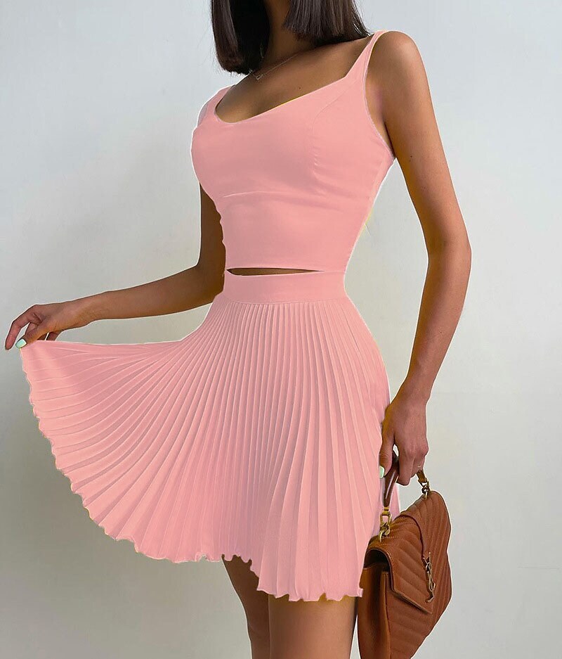 Crop Top Tank Top Skirt Sets Basic Pink Yellow Casual Vacation Plain Pleated V Neck.
