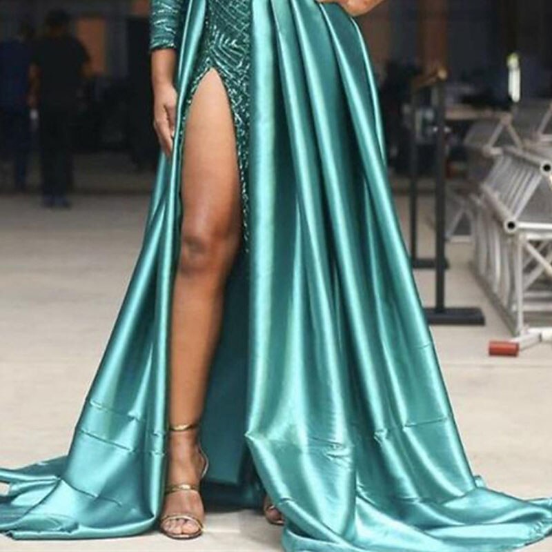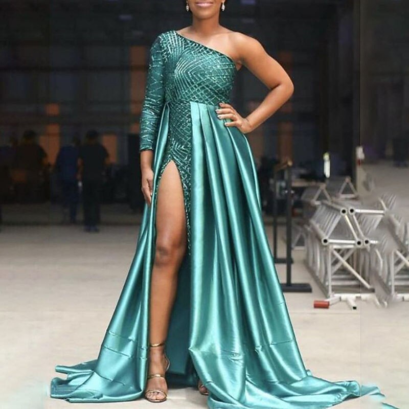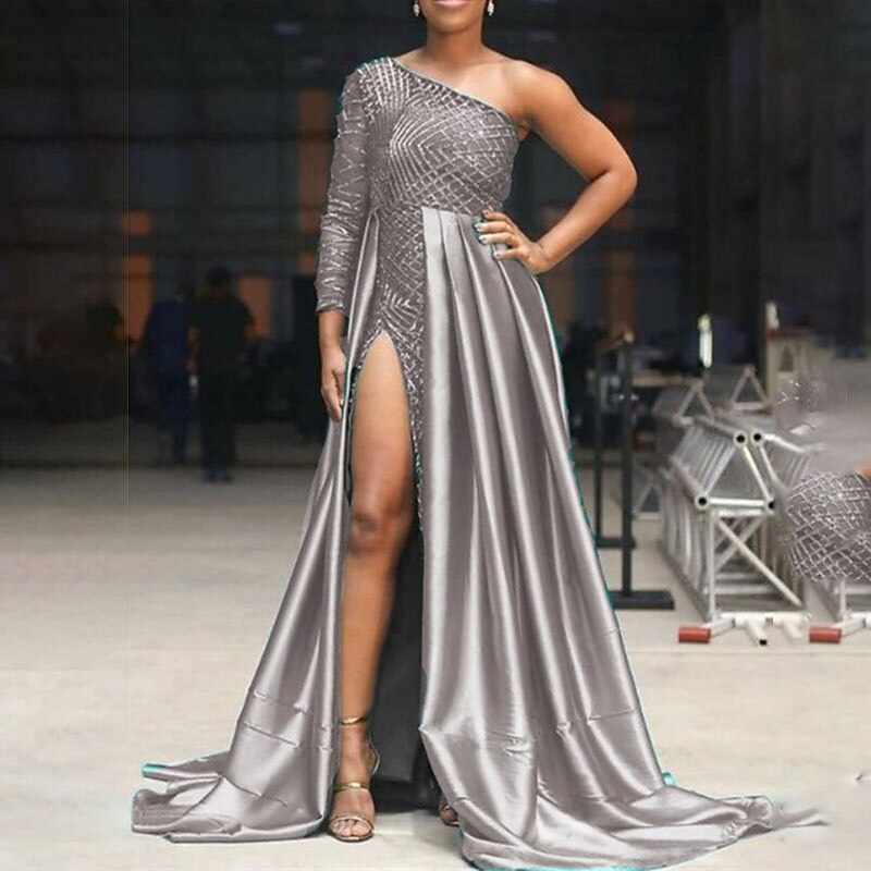 Women's Party Dress Maxi long Dress Green Gray Long Sleeve Solid Color Sequins Split Cold Shoulder Spring Summer One Shoulder Party Stylish Hot.