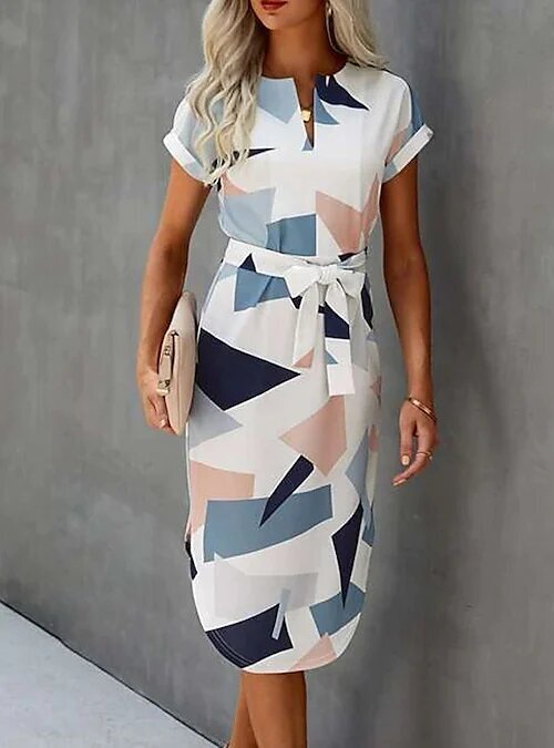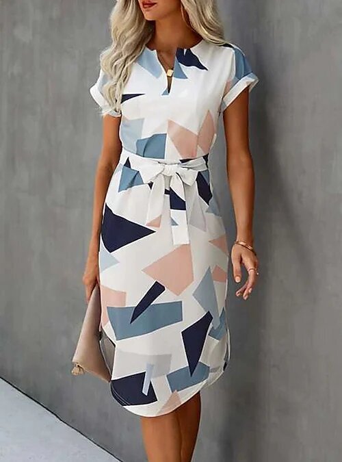 Dress White Short Sleeve Geometric Split Patchwork With Belt Summer V Neck Elegant Modern.