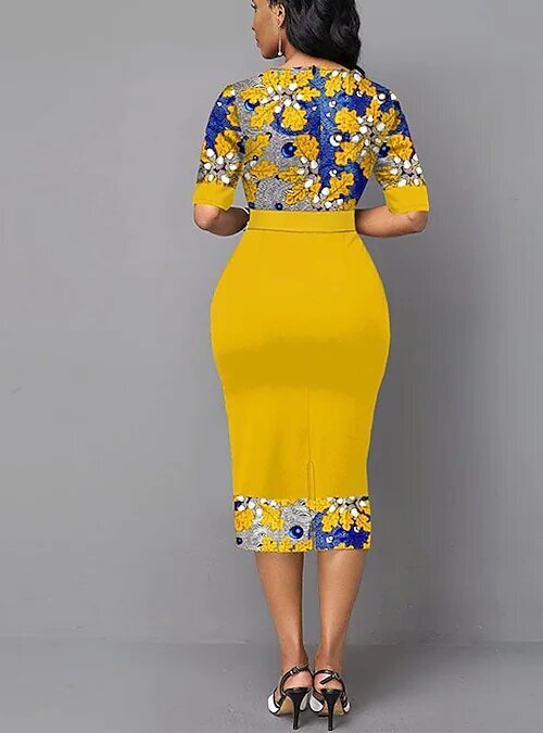 Dress Yellow Short Sleeve Print Print Spring Summer Round Neck Elegant.