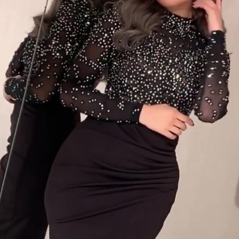 Long Sleeve Solid Color Sequins Split Fall Spring High Neck Party Stylish Hot Party Dress.