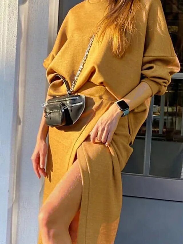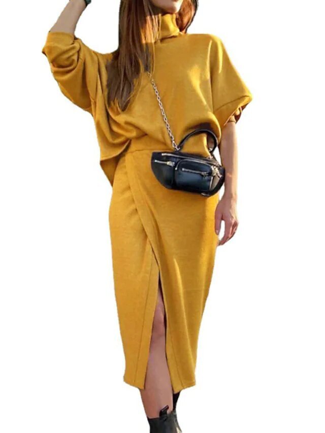 Yellow Long Sleeve Pure Color Split Fall Winter Turtleneck Stylish Modern.