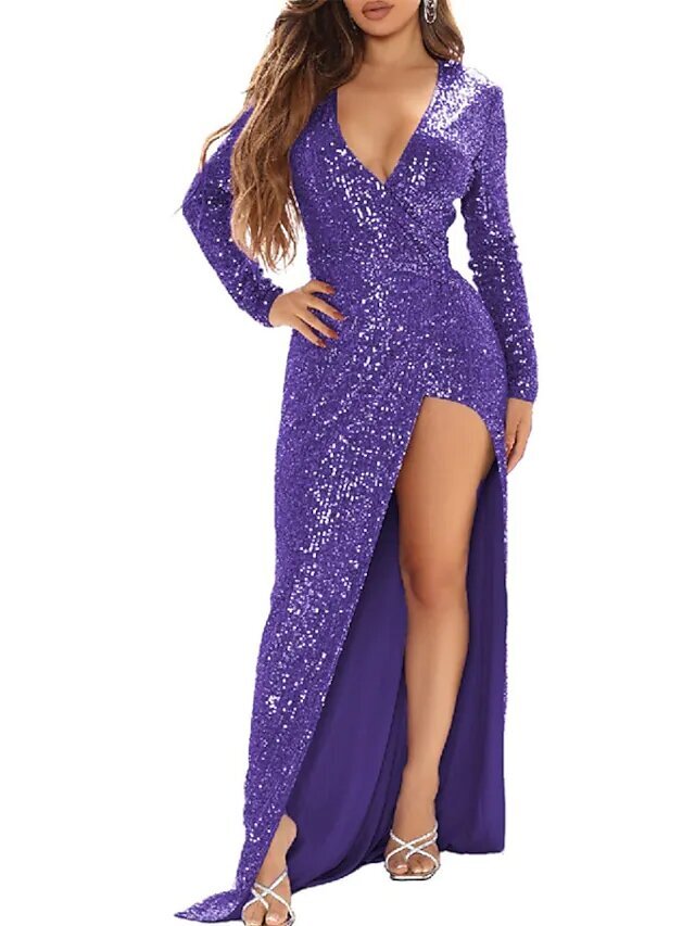 Purple Wine Long Sleeve Pure Color Sequins Split Spring Summer Deep V Fashion Sexy.