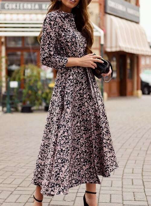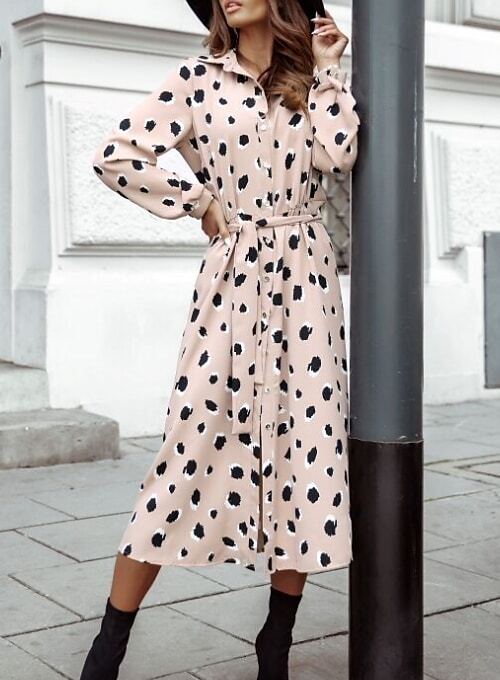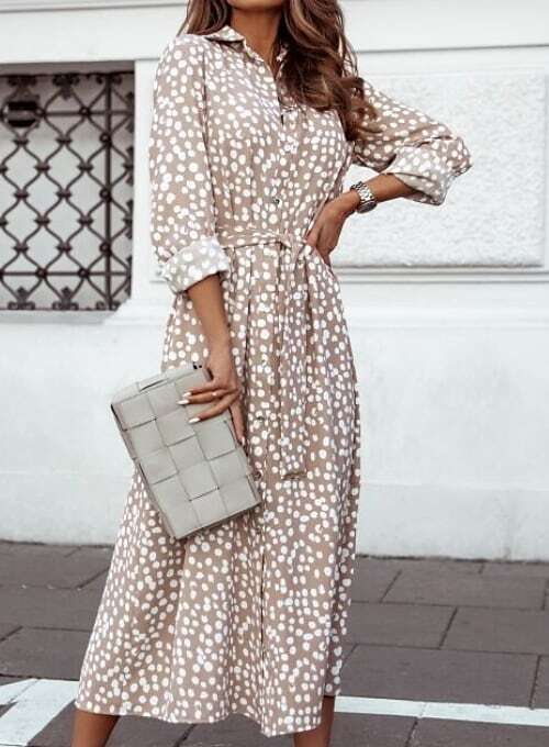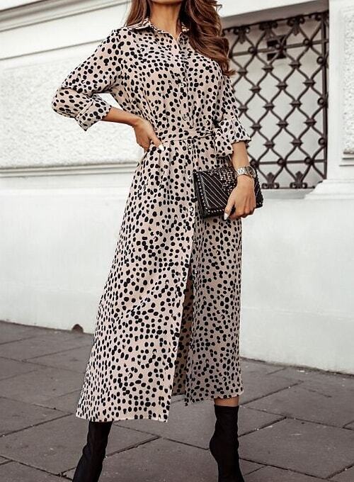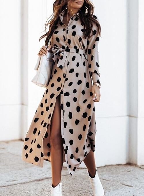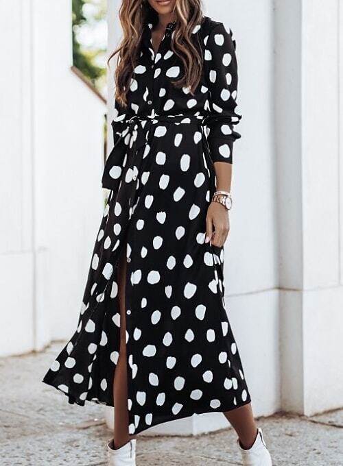 Dark Gray Brown Navy Blue Long Sleeve Polka Dot Print Split Print Summer