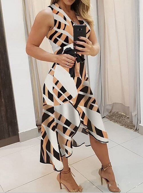 Dress Midi Dress Blue Yellow Red Brown Sleeveless Color Block Geometric Spring Summer V Neck Hot Elegant Slim.