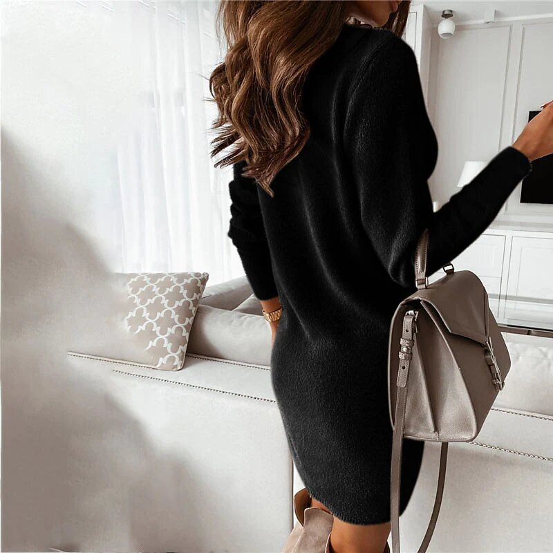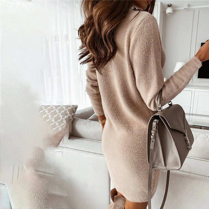 Short Mini Dress Khaki Long Sleeve Solid Color Fall Winter Round Neck Hot Casual.