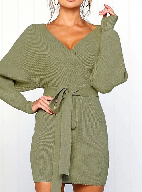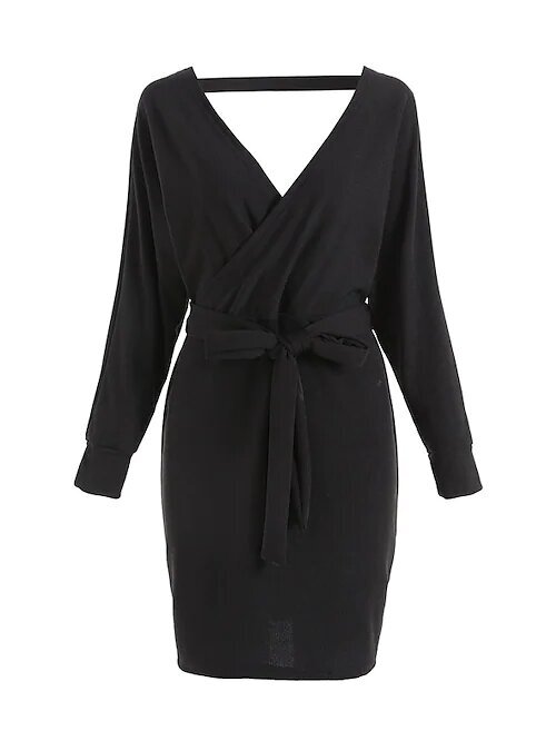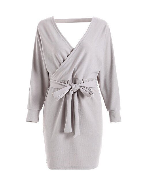 Dress Light Blue Color blue Green Black Wine Gray Long Sleeve Solid Color Backless Lace up Fall V Neck Work Elegant Casual.