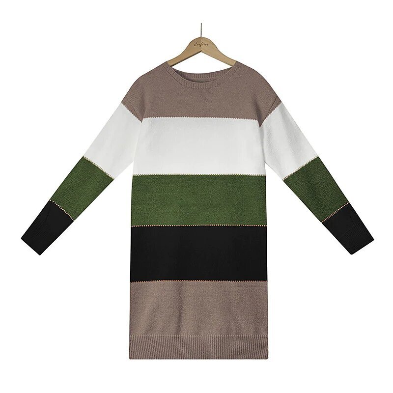 Mini Dress Green Blue Black Gray Khaki Long Sleeve Striped Patchwork Fall Winter Round Neck Elegant Casual.