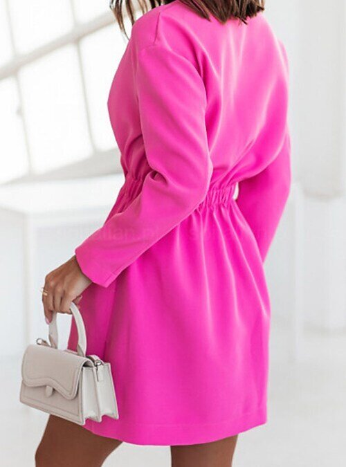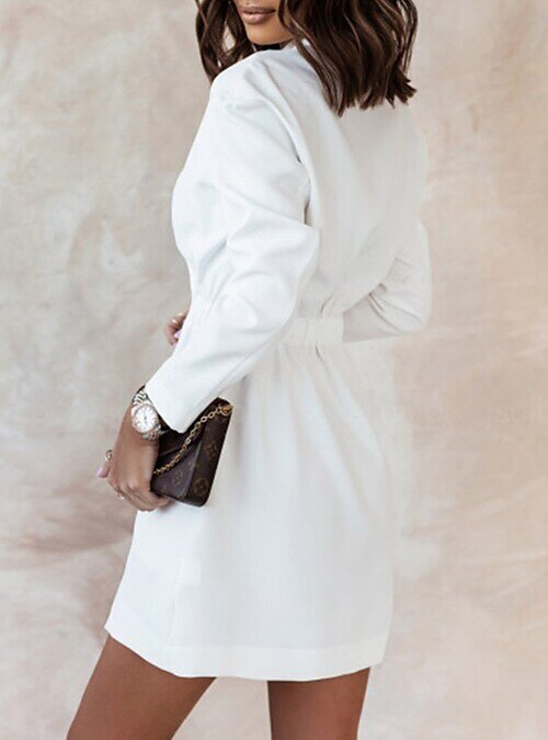 Mini Dress White Blue Fuchsia Beige Long Sleeve Pure Color Ruched Button Fall Spring Shirt Collar Stylish Mature.