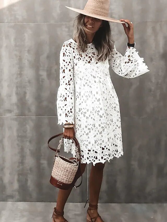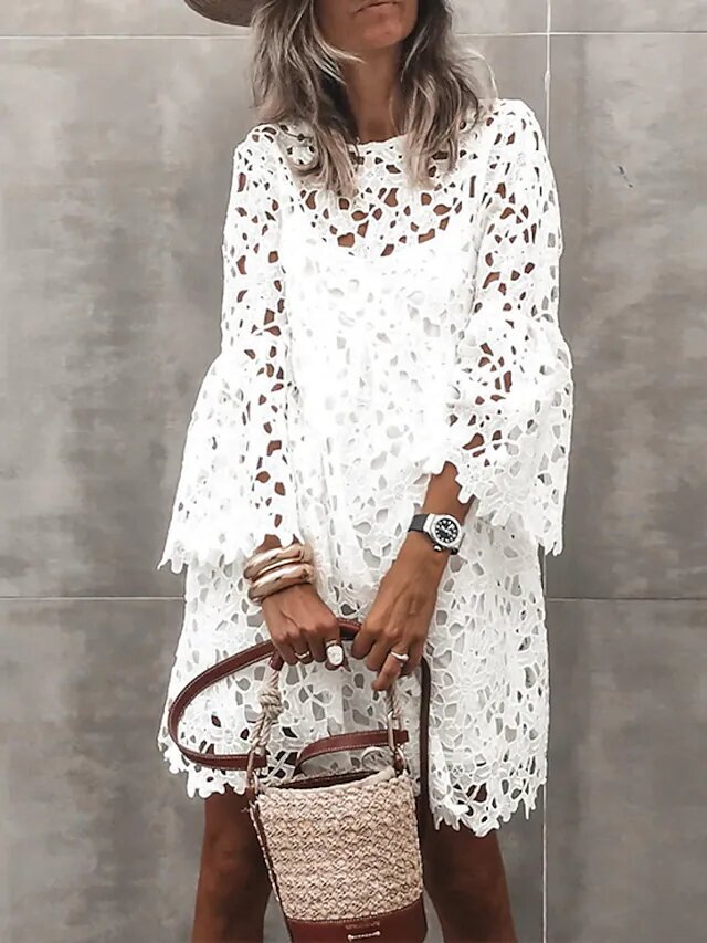 White Long Sleeve Solid Color Lace Hollow To Waist Spring Summer Round Neck Elegant Romantic Flare Cuff Sleeve.
