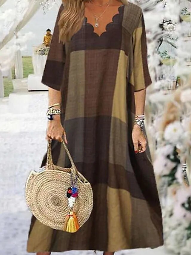 Khaki Half Sleeve Color Block Patchwork Summer V Neck Casual Modern.